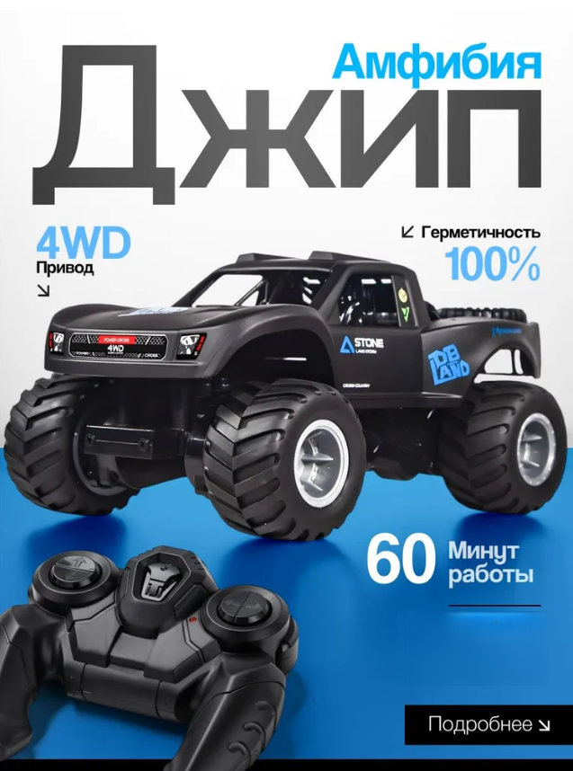 Джип на пульте управления амфибия. Эта машинка на пульте управления выполнена в виде вездехода, который может преодолевать любые препятствия, в том числе водные преграды и каменистые поверхности. Материал джипа на пульте управления – металл, пластик и резина – обеспечивает ей долговечность и безопасность при игре.