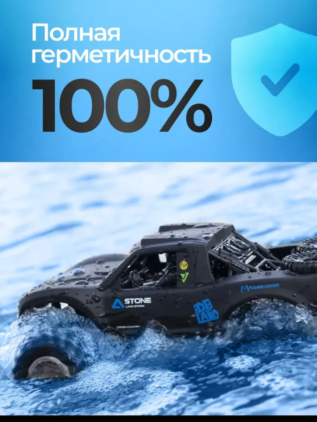 Машинки на пульте управления полностью герметична и оснащена большими каучуковыми колесами. Это позволяет играет ей передвигаться в воде и не тонуть.