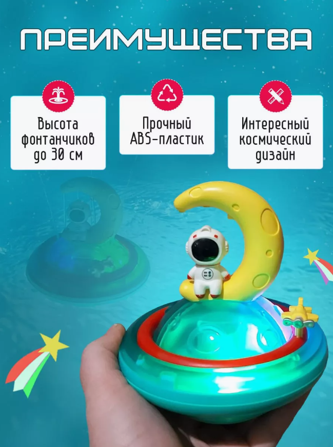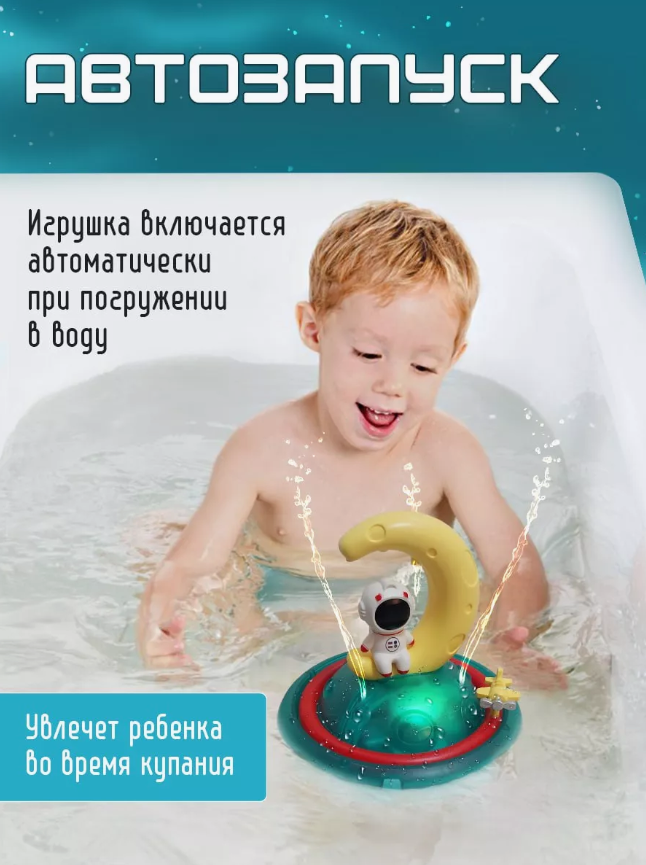 Великие приключения ожидают малышей в их собственной ванной. Прекрасная игрушка, которая превратит обычную ванну в неповторимый фонтан удивления. Светящаяся игрушка для ванной, или как ее еще называют - "игрушка фонтан", поможет вашим малышам развить моторику - опустите игрушку в воду, чтобы увидеть космическое шоу: игрушка будет весело кружиться по воде, пуская красивые струи фонтана вверх, самолетик будет быстро крутиться вокруг астронавта, а яркие огоньки создадут волшебную атмосферу.