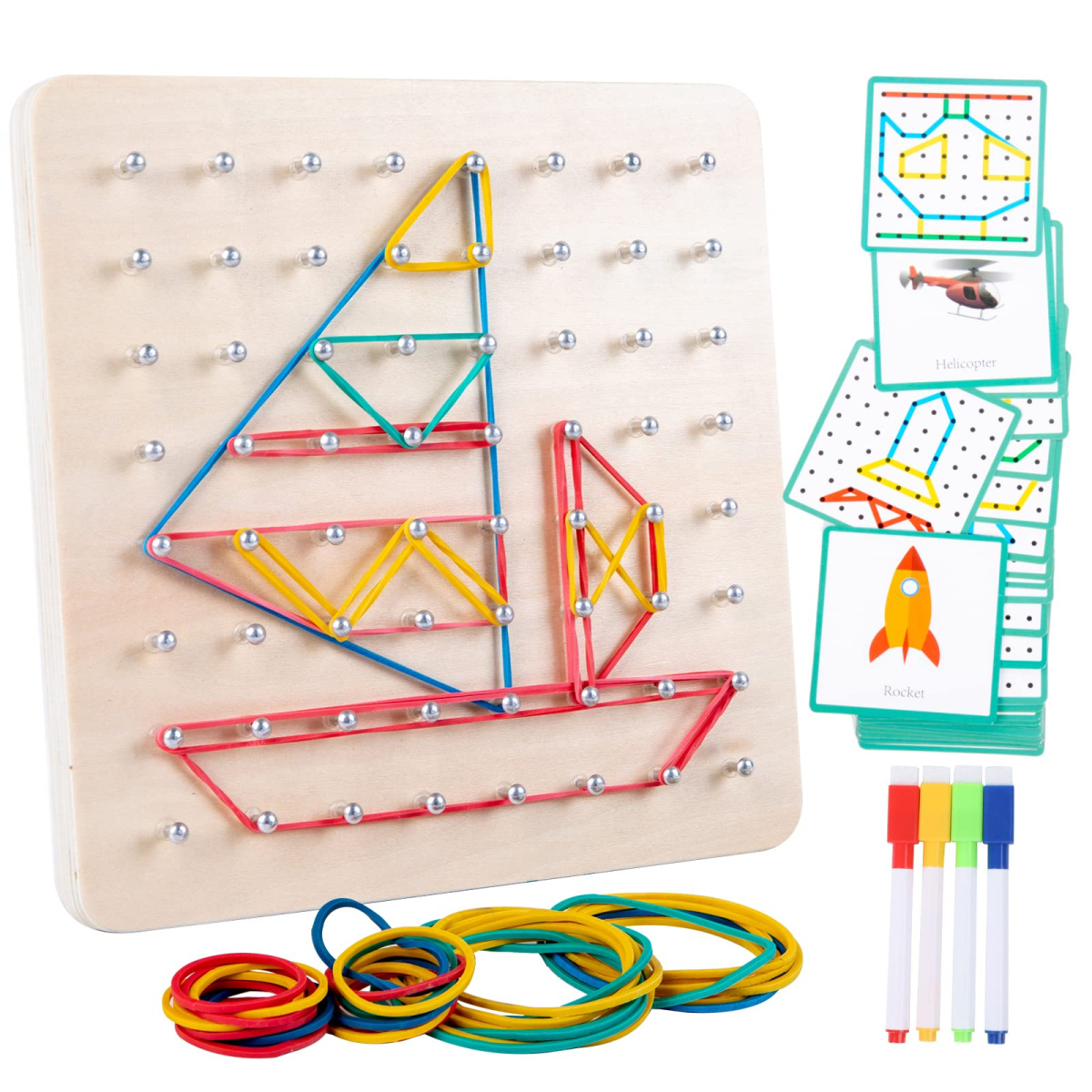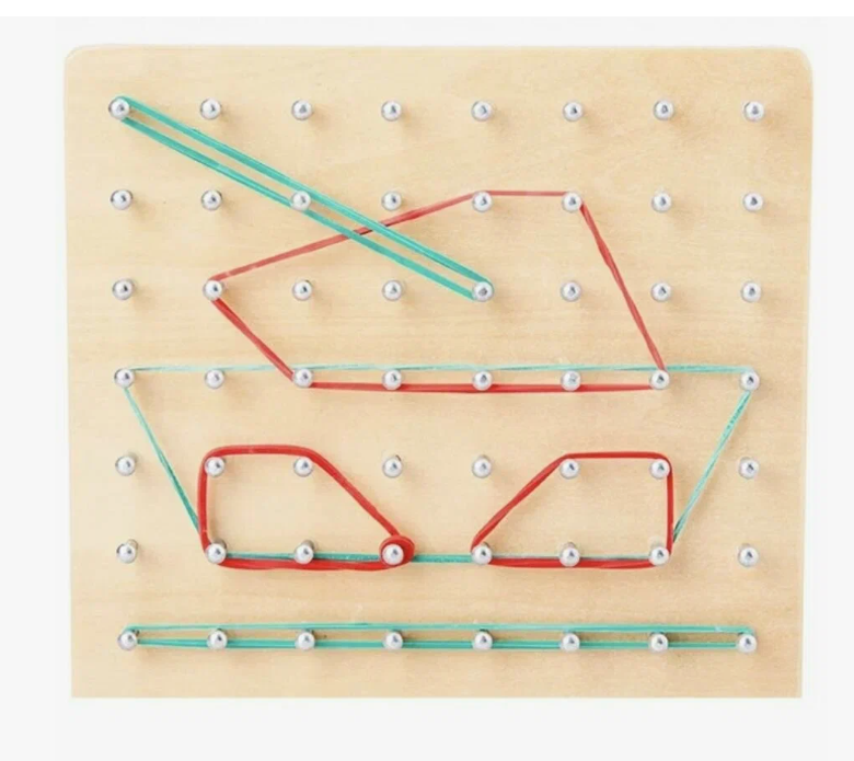 игровом поле равноудаленными друг от друга по горизонтали и вертикали, за которые можно цеплять резинки. Развивающая игрушка позволяет сконструировать на плоскости множество различных изображений,сложи узоры, различные предметы и животных. В математический планшет с резиночками начинать заниматься можно с 1,5 - 2-х лет, но даже младшему школьнику и школьнику будет интересно.