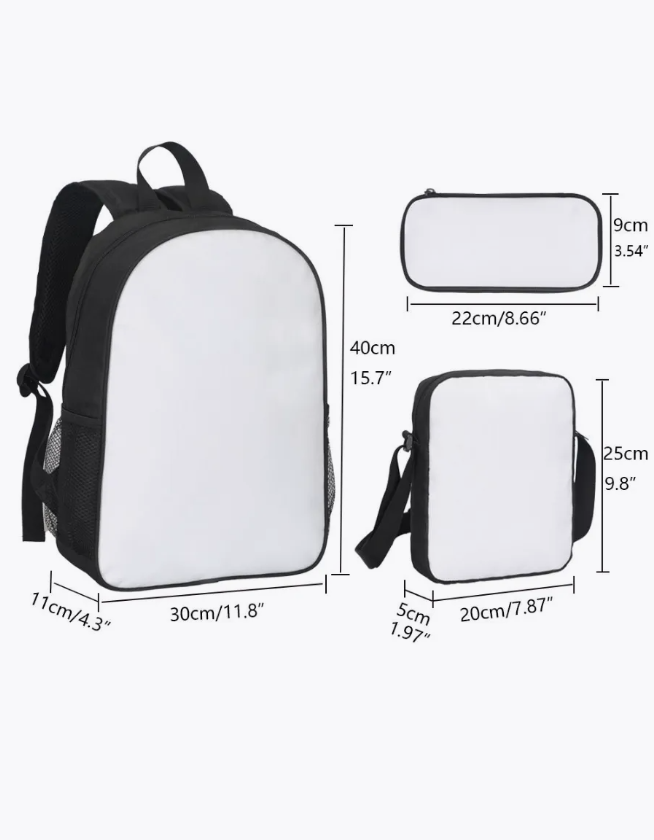 Размеры: рюкзак - 40х30х11см, сумка - 25х20х5 см, пенал - 22х9 см.
