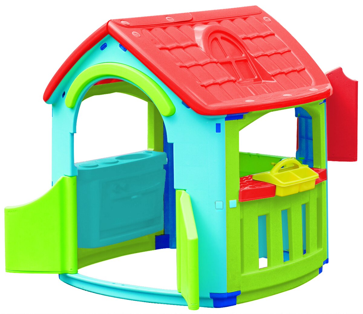 "Домик-Кухня-Мастерская. Размер:101х108х110.5 Домик сделан из качественного пластика. Имеет красочный дизайн, имитирующий «реальный дом». Удобная конструкция позволяет легко собирать домик, а также без труда размещать его как в квартире, так и на природе. В домике две распашные низенькие дверки, при закрывании фиксирующиеся снизу. На окошке двухстворчатые ставенки, при закрывании фиксирующиеся снизу. Благоустроенная мастерская – съемный ящичек с 3-я отделениями и удобной ручкой, на подоконнике есть отверстия для вкручивания винтов или инструментов (в комплект не входят), а также настоящие «рабочие» тиски