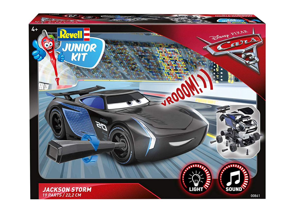Джексон Шторм (англ. Jackson Storm) — гонщик-новичок, являющийся лицом нового поколения высокотехнологичных автомобилей. Соперник Маккуина и главный антагонист мультфильма. Особенности: Легкая сборка, для сборки этой машинки краски и клей вам не потребуются, соединение происходит посредством специальных зажимов При нажатии на капот загораются фары и модель издает звуки работающего двигателя Имеются сменные детали для двух выражений лица Откидывается капот Можно снова разобрать Можно украсить прилагаемыми наклейками