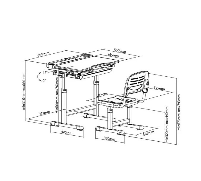 Поверхность учебного стола можно наклонять до 45 ° для удобного письма, чтения и рисования.